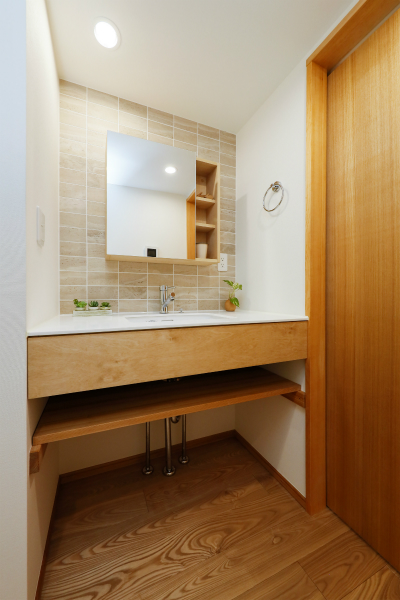A様邸では床にスペリオルアッシュの無垢フローリングを使用して、木のぬくもりを感じられるインテリアになっています。それに合わせて水まわりなどの設備もあたたかみのあるものをお選びになりました。