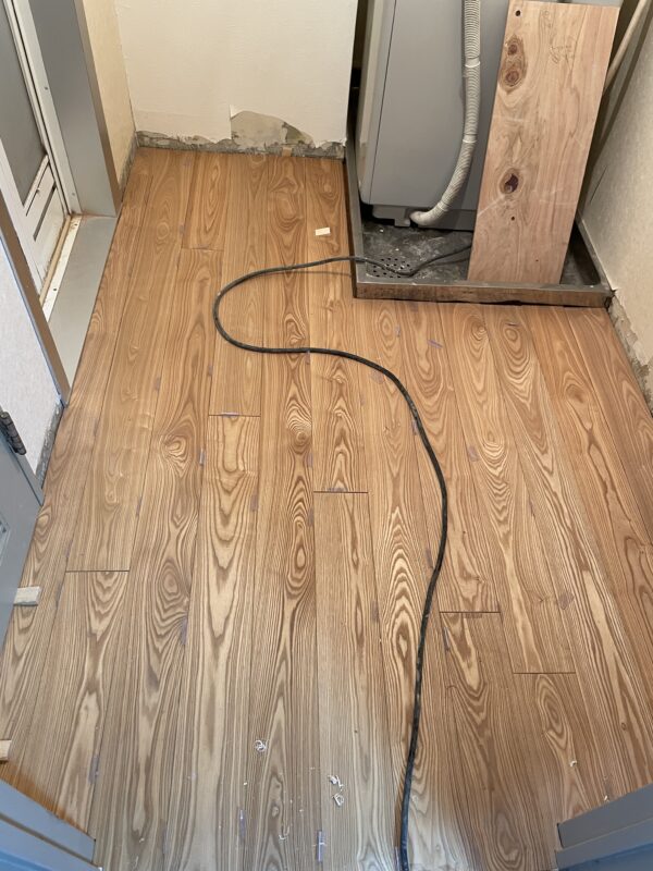洗面ボールを解体し、まずは床を無垢フローリングを張っていきます。
