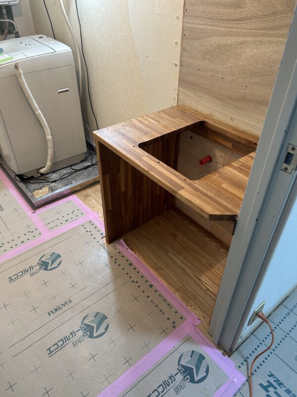 新宿区K様邸のキッチン工事が完了したので、次に洗面台を造作した様子をご紹介いたします。