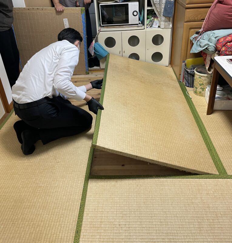 ▼薬剤噴霧の為、畳の下地の一部を解体し、機械が入る大きさに点検口を設けます。