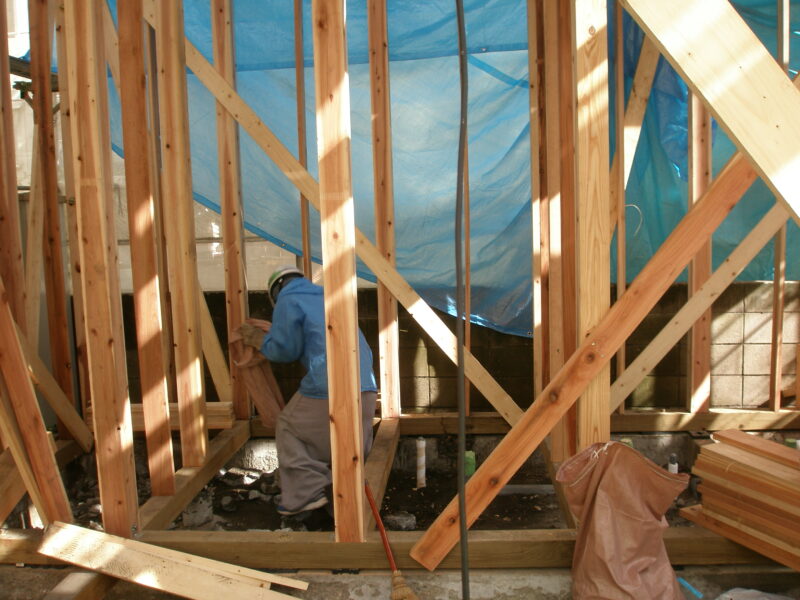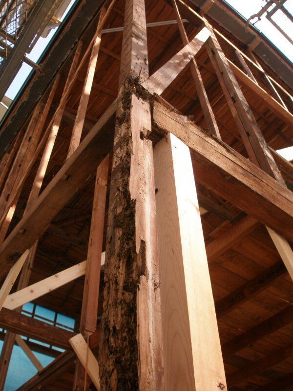 どうしても抜けない柱は、横に新しい柱を添えて補強しています。