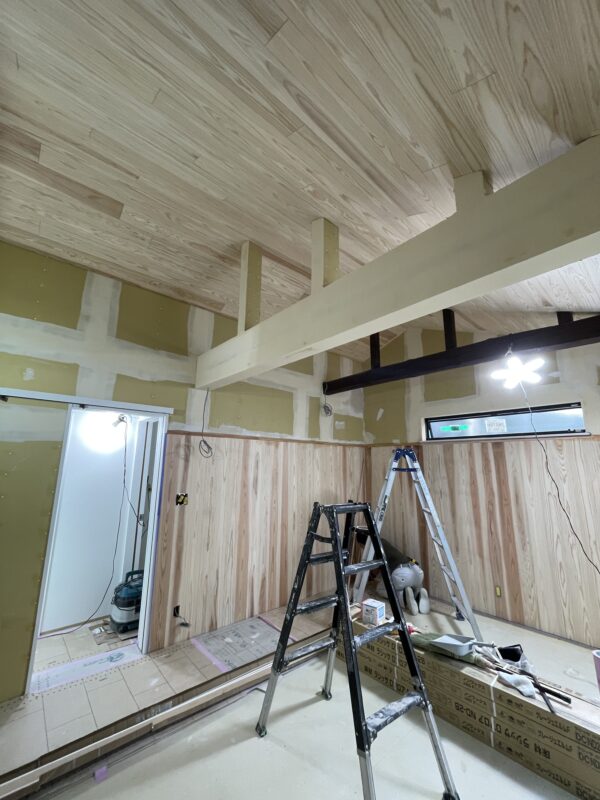 天井を見上げると綺麗な杉の木目が見えます。すべて完成したらシーリングファンが設置されますので、お施主様がご希望の西海岸風のインテリアになりますね。