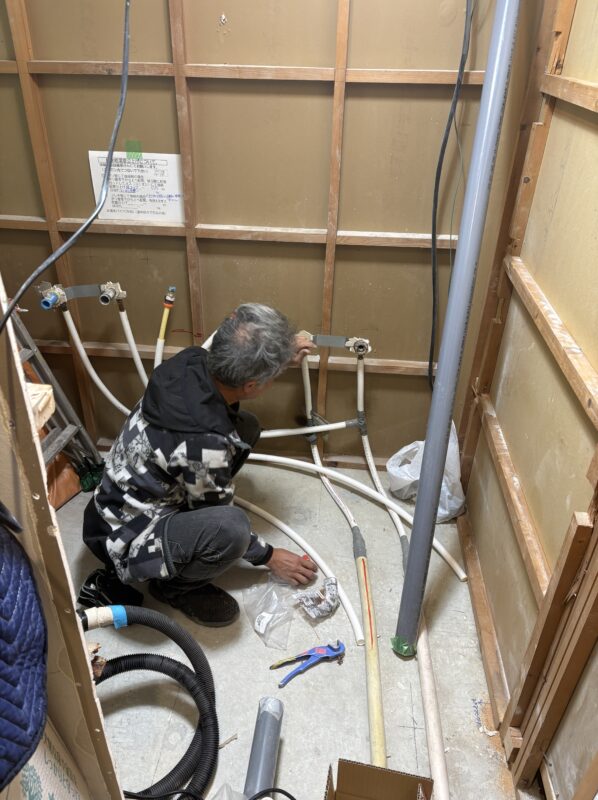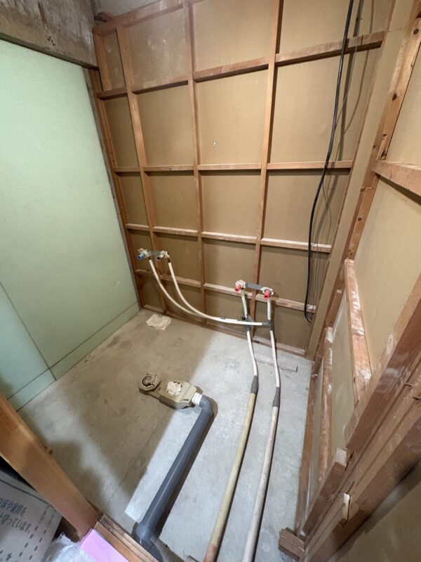次に、新しく入る浴室に合わせて、給水・給湯・配管の位置を調整していきます。