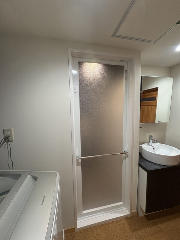 浴室の扉や枠も綺麗に収まり、補修したクロスも周囲となじんで、何もなかったかのように元通りに!!
