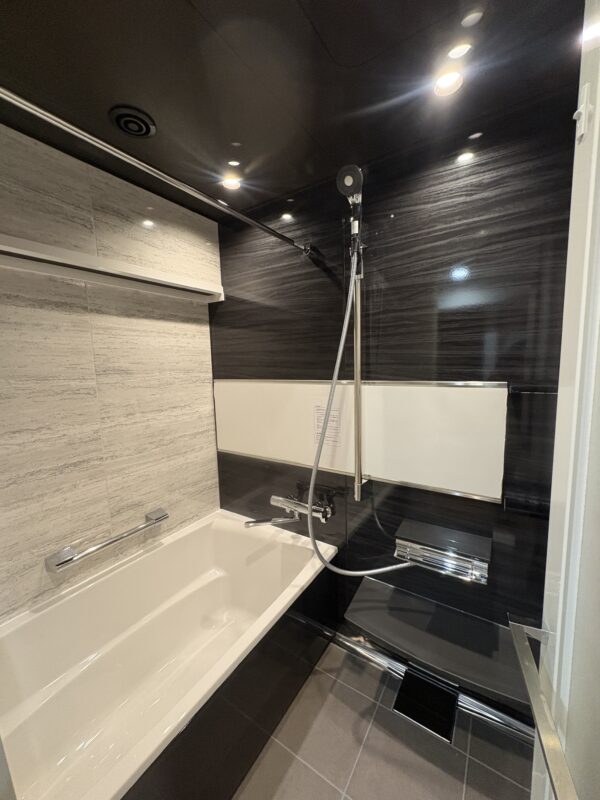 大理石調のパネルとブラックのアクセントパネルが高級感のあるシックでカッコいい浴室となりました。