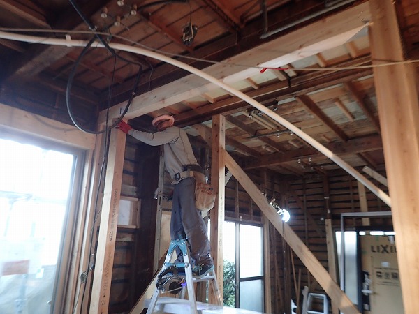 床が出来上がってくると、電気の職人さんが配線を行います。