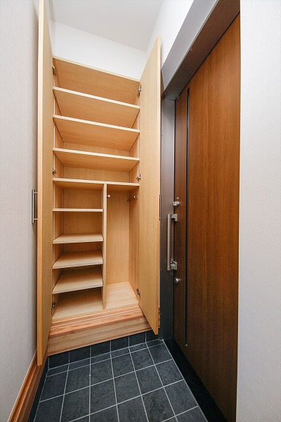 ▲玄関扉のほうを向くと、大きな玄関収納が。