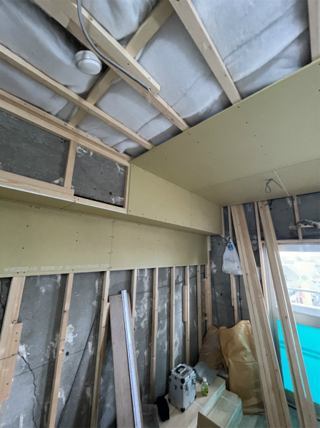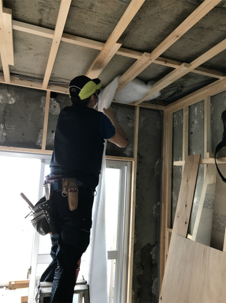 室内は床と同様に、天井にも断熱材を入れ込んでいきます。マンションはもともと戸建よりも冷暖房効率が高いとされていますが、お部屋の中でも床と天井でしっかり断熱すると、省エネ効果がさらにアップします。