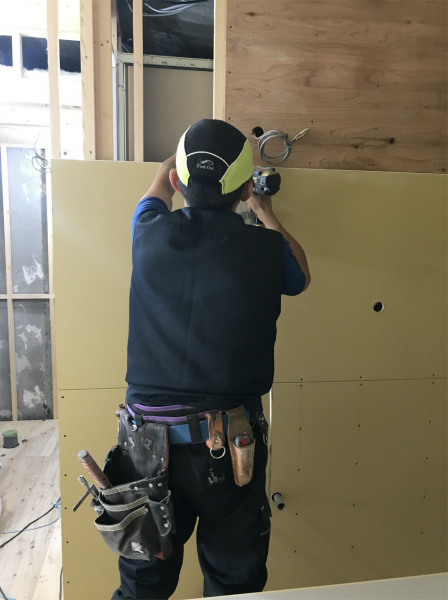 壁や天井にボードが張られ、下地が出来上がっていきます。