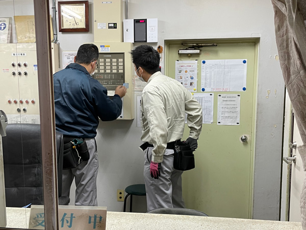 ▲管理人室にある中央制御との接続を確認しています。