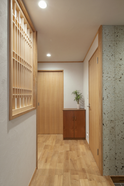 玄関扉を開けて正面の壁にはアクセントになる大谷石を張りました。