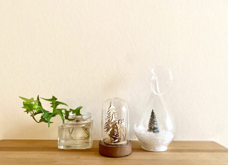 ガラスドームの中に小さなツリーやオブジェを閉じ込めたようなデザインは、