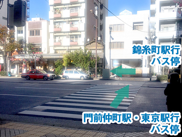 錦糸町行きの場合は、そのまま門前仲町方面へ進みます。門前仲町・東京駅行きの場合は、永代通りを向かい側へ渡り、門前仲町方面へ進みます。