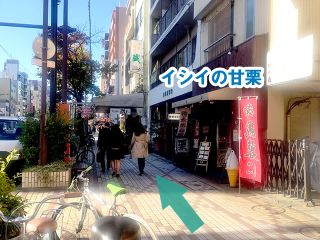 右手にイシイの甘栗があります。そのまま真っすぐ進みます。