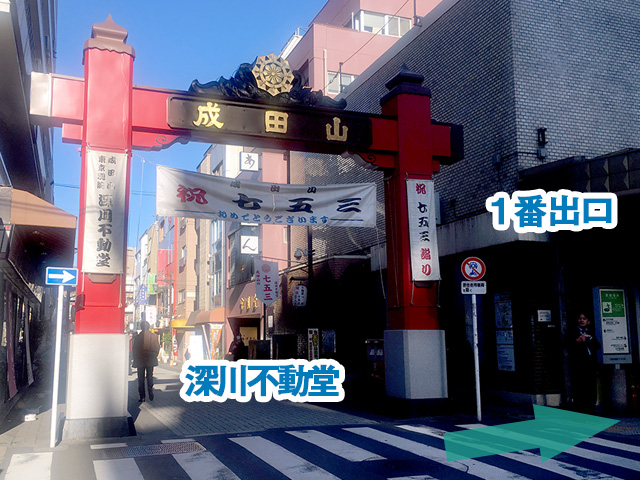 2番出口を上がった場合は、深川不動堂の赤い山門がある永代通りの向かい側に渡ります。