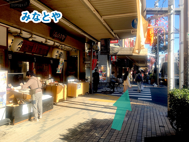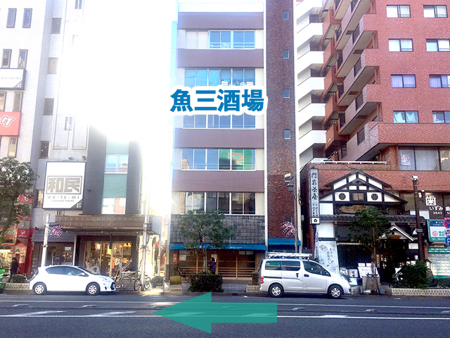 右手に、魚三酒場が見えます。そのまま真っすぐ進みます。