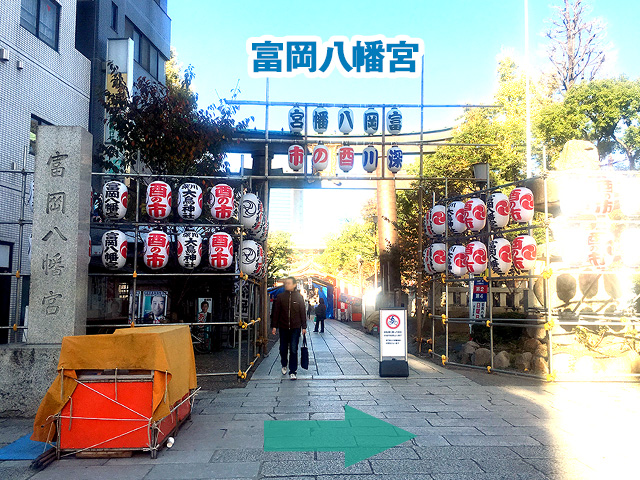 ファミリーマートを過ぎると、左手に富岡八幡宮の鳥居が見えます。もう少し真っ直ぐ進みます。