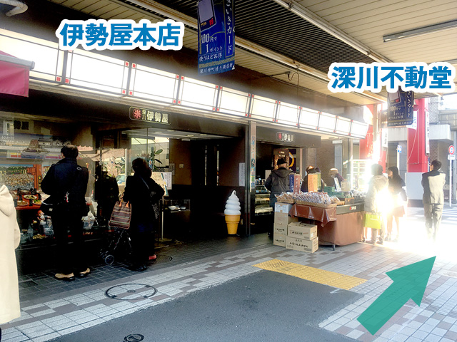 左手に伊勢屋本店があります。その隣が深川不動堂の赤い山門です。ここからは東西線 門前仲町駅からの道のりをご覧ください。
