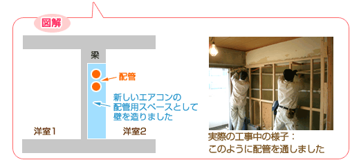 K様邸では、上の図解のように、梁の下に壁を造ることで、違和感のないような配管を上手く行うことができました。