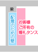 配管用スペースを造る為に増設した壁は、奥行きが30cmほど。限られたマンション空間の中では、少しもったいない スペースとなってしまいました。 しかし、図にもありますとおり、こちらのスペースには マンション特有の梁があります。 梁の下は、天井高さが1m90cmほど。しかし、このお部屋には、お客様がお持ちの高さ2メートルの婚礼タンスを 置かれるご予定でした。 しかし、タンスの高さは2m以上あり、梁が邪魔になってしまいそうでした。 なので、あえて、梁の下の1メートル90センチの部分は壁にして タンスをぴったり壁に付けて置けるようにすることにしました。 大切な品であるご婚礼タンスを置く場所を確保しつつ、 設備的な面でも、ご要望をクリアできた訳です! |