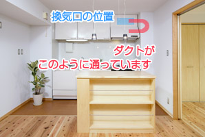 しかし、こちらのマンションの場合、昔のキッチンの仕様に合わせ、吸気穴と排気穴は離れて付いています。