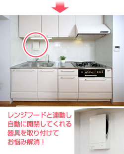 普段は閉じていて、レンジフードのスイッチを入れた時には連動してシャッターが開き、吸気が出来るようになる部材を