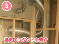 この換気口のままだと整流板が取り付けられないので、ダクトを使うことに! 換気口にダクトを取りつけ、このように配管します。
