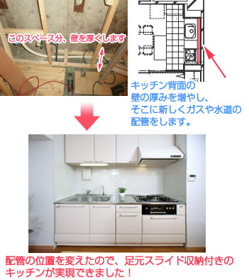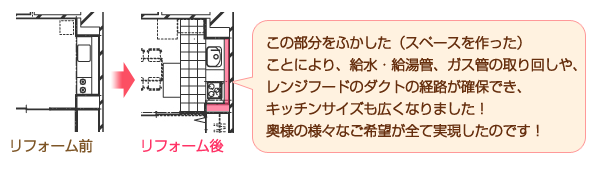 ですから、上の図のように、キッチン周りの壁をふかす(スペースを作った)ことで、様々な配管の問題が解消でき、