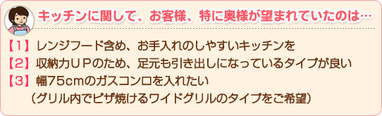 キッチンに関して、お客様、特に奥様が望まれていたのは以下の点です。