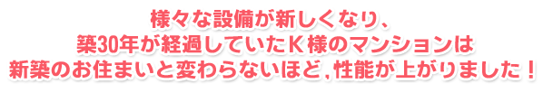 様々な設備が新しくなり、築30年が経過していたK様のマンションは