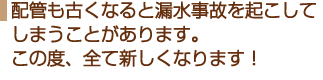 配管も古くなると漏水事故を起こしてしまうことがあります。この度、全て新しくなります。