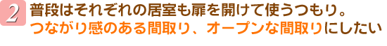 【2】つながり感のある、オープンな間取りにしたい。普段はそれぞれの居室も扉を開けて使うつもり。