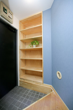 限られたスペースの玄関ですが、奥に青のアクセントカラーがあることで、
