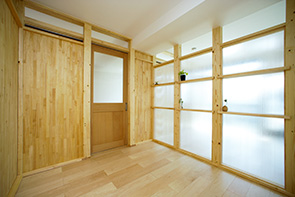 Y様は20年前に一度リフォームをなさっていて、その際には、シックなインテリアで統一されていたのですが、近年は、お子さんのためにも「明るい印象に変えたいな」とお考えでした。新しくなった空間は、間仕切りの集成材パネルを始め、柔らかい印象の素材や、半透明の板が嵌った無垢の建具を使い、なんとも言えず優しい、透明感のある印象になりました。