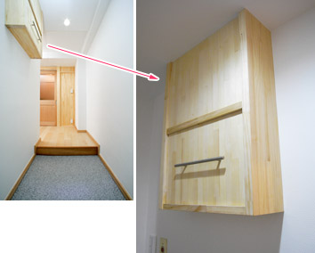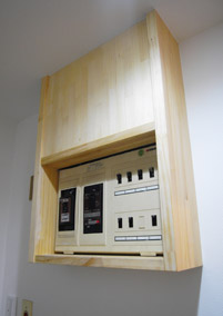 マンションの場合、このように玄関に分電盤があるケースが多く、ちょっと目立ってしまうんです。 Y様もこの分電盤はちょっと気になっていて、リフォーム前はご自分で箱を作って隠しておられましたが、この度、大工さんがぴったりにボックスを造りました。