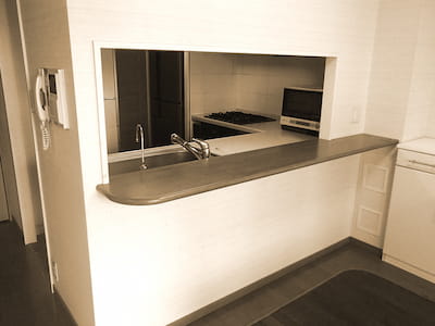 こちらのマンションでは可能でしたが、築年数の長いマンションですと、キッチンの交換はできても、位置は変更できない場合もあります。ご注意ください。
