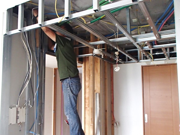 天井内部の配管を施工しています。キッチンのレイアウトが変わることにより、コンセントやスイッチの位置が変わり、配線も新しく引き直す必要があります。