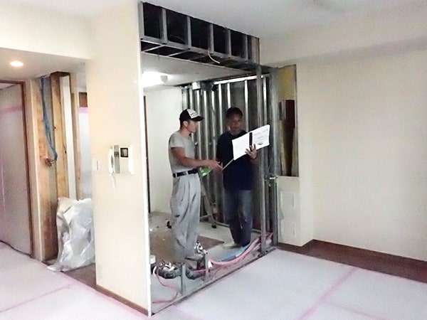 まずは既存のキッチンを解体し、壁を取り除きました。床はそのまま使うため、他に傷をつけないよう養生を施し、丁寧に解体します。