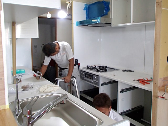 システムキッチンといっても、部材がバラバラに搬入されてくるため、職人さんが一つ一つ組み立てていきます。