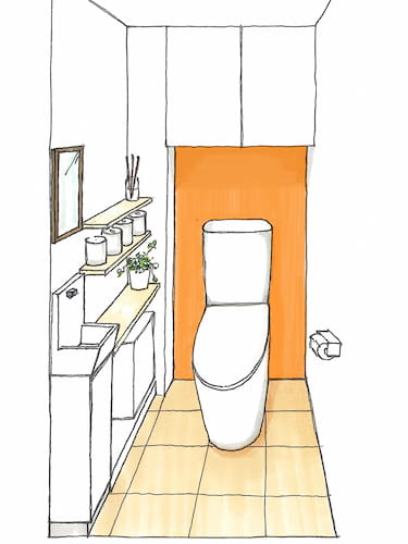 トイレのような小さい空間はインテリアでも冒険がしやすい箇所なので、奥にオレンジのアクセントクロスを取り入れています。