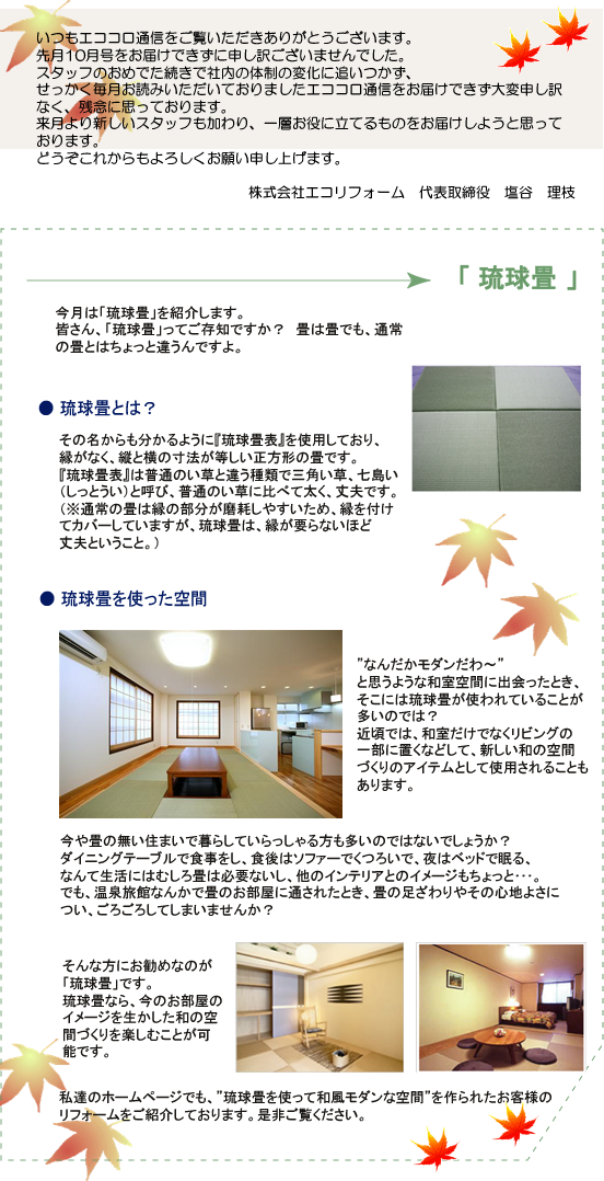 この「エココロ通信」は、皆様にエコロジーに関する情報と、私たちエコリフォーム社の想い(ココロ)をお届けしようと創刊致しました。エコとココロを合わせて「エココロ」です。