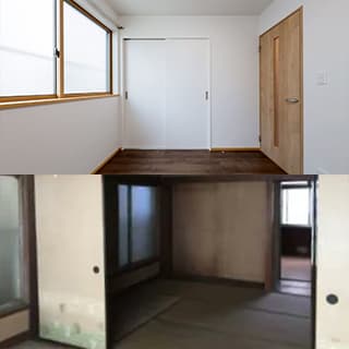 こちらはお子さんの部屋その3、After←Beforeです。ビフォーアフターで和室から洋室へ変わりました。床の間はクローゼットに、押し入れはオープン棚になり、現代的なお部屋に大変身です!