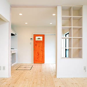 昔のリフォーム事例をリニューアルしました。広々としたホワイトのLDKは奥様の好みなんだそうです。オレンジに塗装した扉もとってもキュート!キッチンもおしゃれなので、ぜひチェックしてみてください。